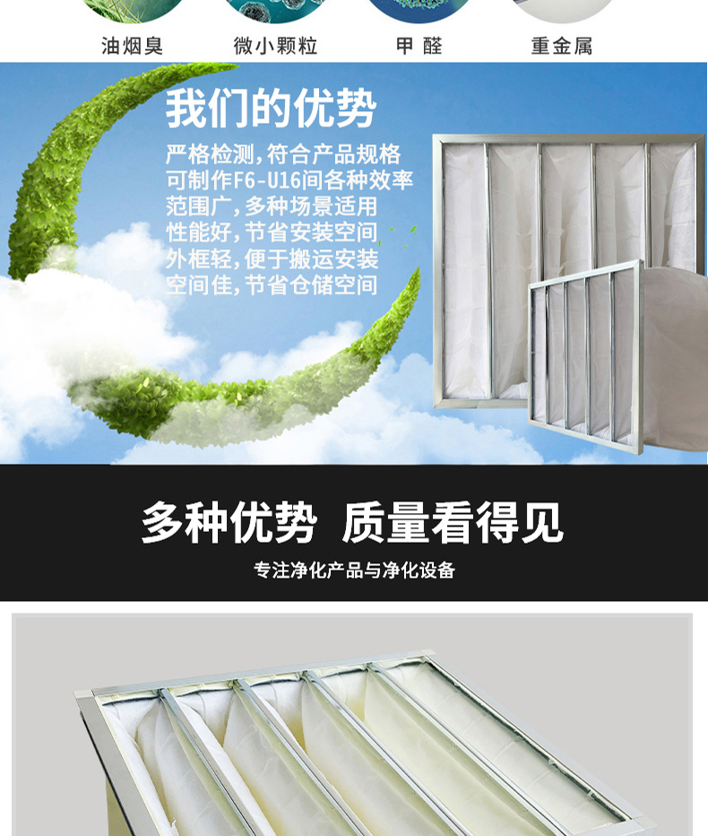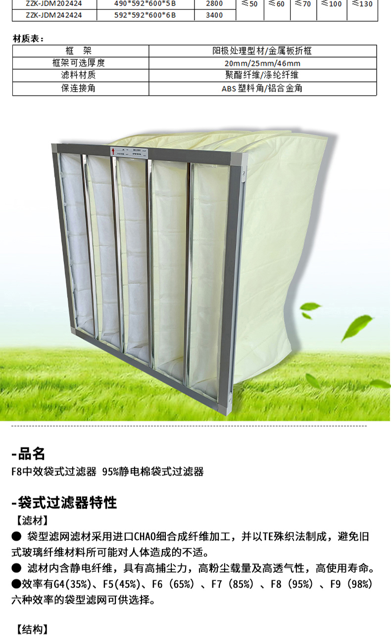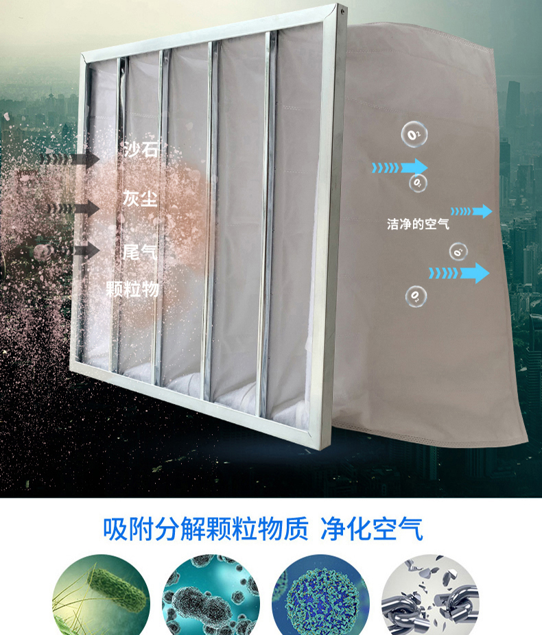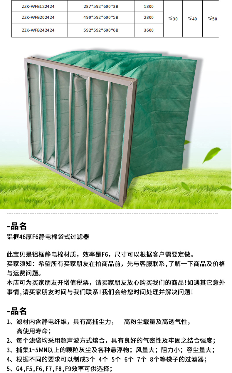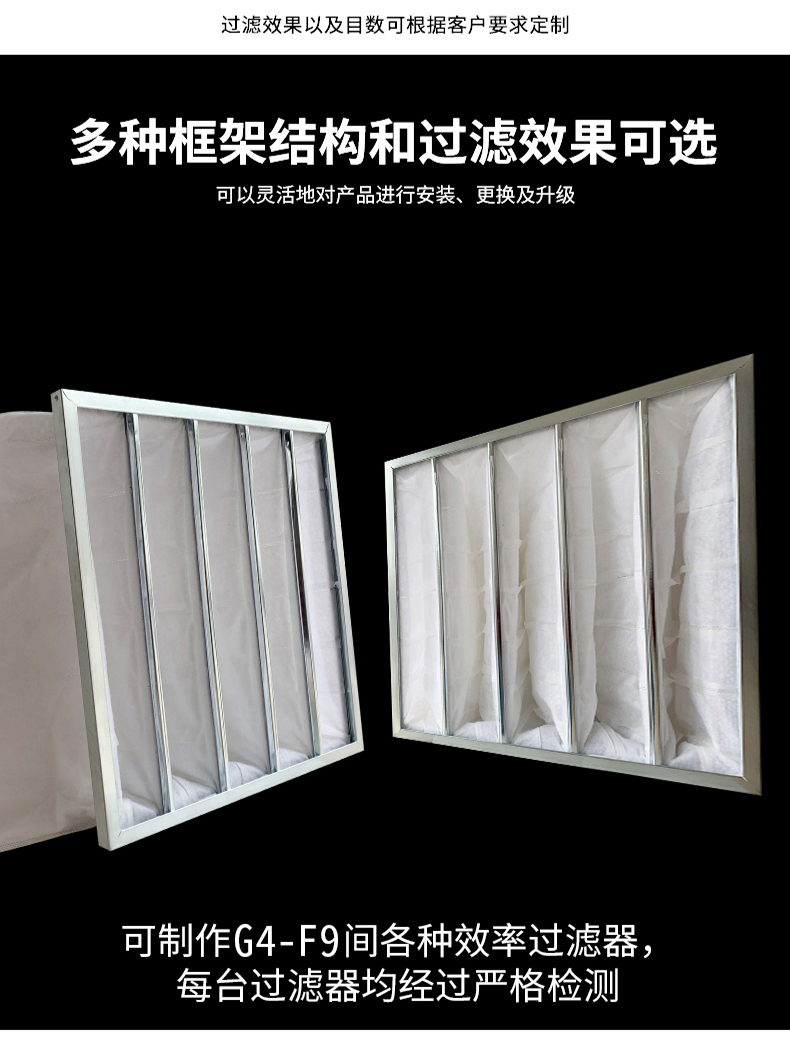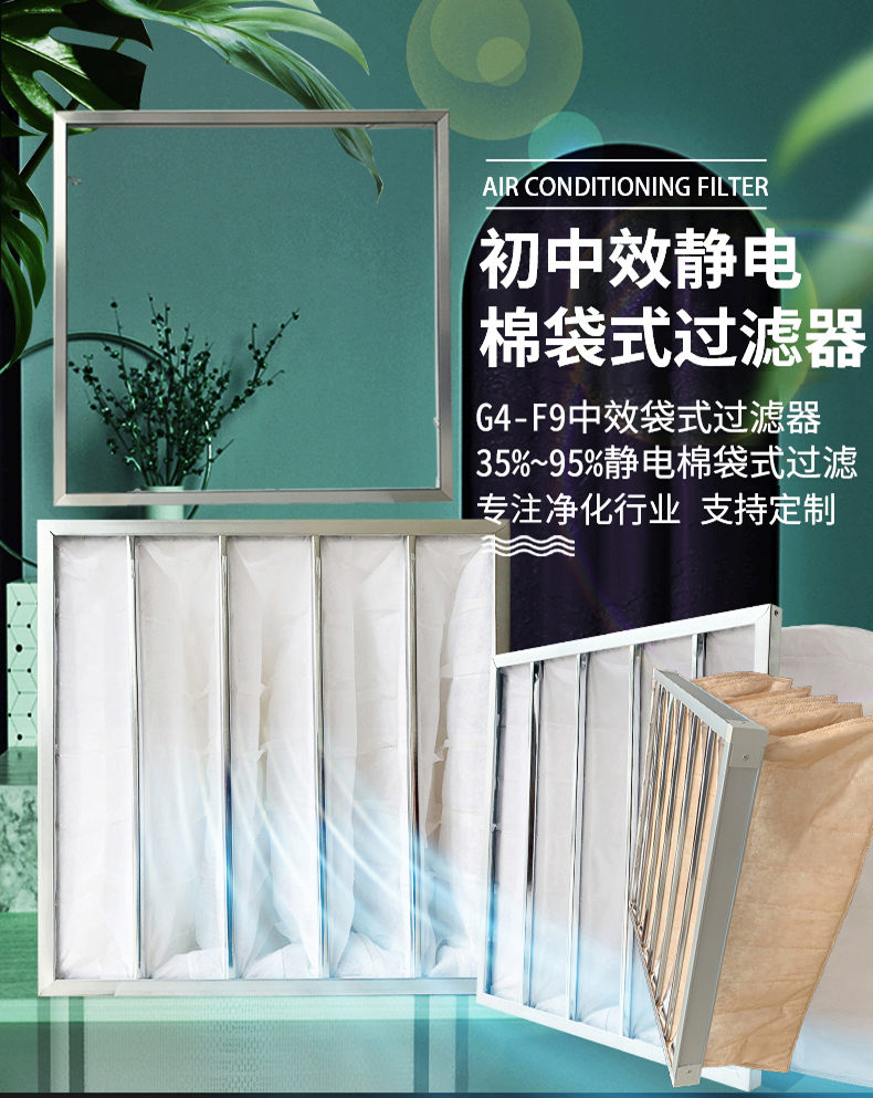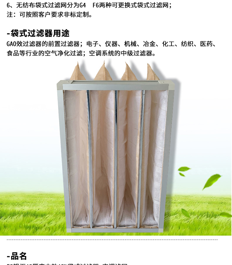 ● 袋型過濾器過濾材料寬容進氣口超關聯度解破璃纖維板生產加工,即為格外織法治社會成,制止老式破璃破璃纖維板資料所應夠對機體養成的身體不適。 ● 過濾器材不含靜電纖維素,具備著高捕塵力,高煙塵載量及高防臭性,高憑借期。 ●法律請求效力有G4(35%)、F5(45%)、F6(65%)、F7(85%)、F8(95%)、F9(98%)多種法律請求效力的袋型過濾網可供做好。【布局】