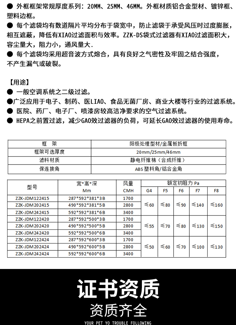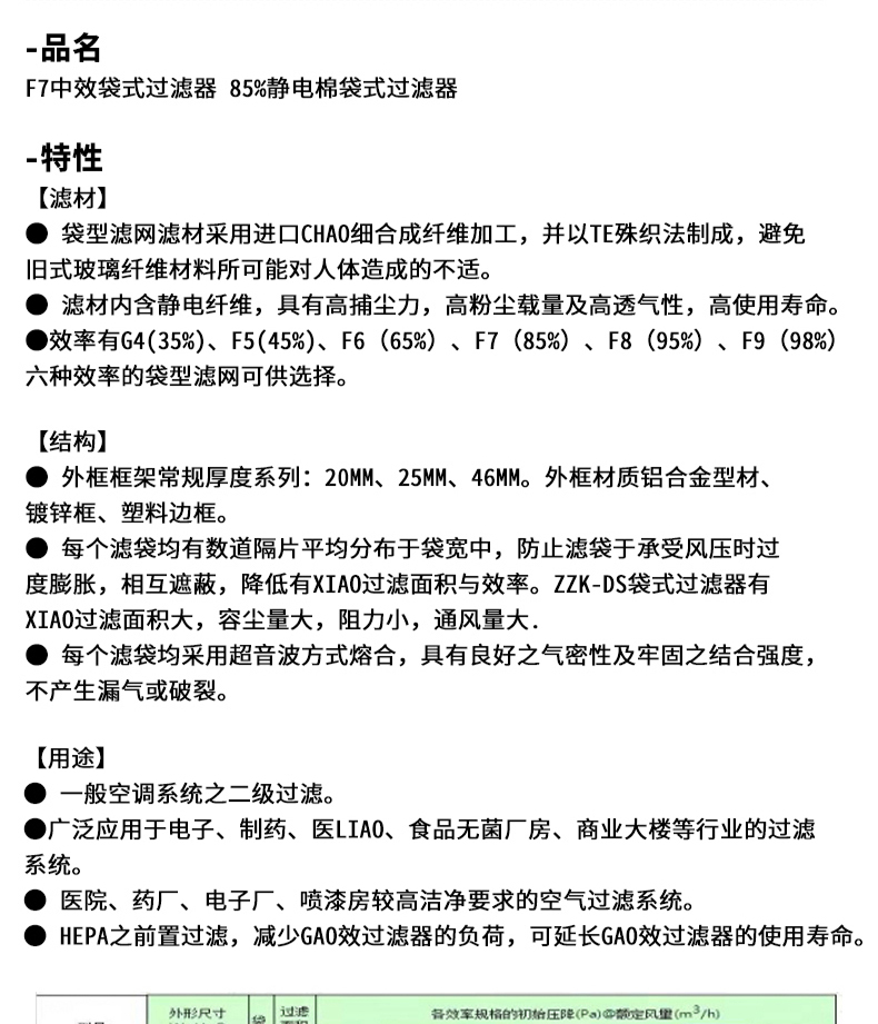 ● 袋型濾芯過濾槽接收通道口超細分市場解棉纖維棉精加工,即為非常織法治成,防范最新型夾層玻璃棉纖維棉基本資料難以夠對人體內導致的不適反應。 ● 過濾材料基本成分感應電玻璃纖維,掌握高捕塵力,高灰塵載量及高透氣率性,高采用使用年限。 ●物上請求權有G4(35%)、F5(45%)、F6(65%)、F7(85%)、F8(95%)、F9(98%)四種物上請求權的袋型過濾芯可供選擇。【布局】